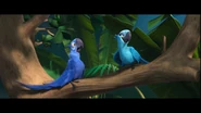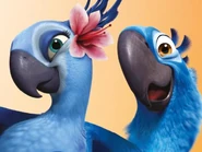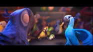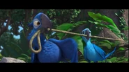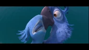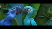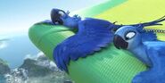 Kids überrascht. Mit einer Finte getäuscht landen beide letztendlich auf dem Boden, jedoch hilft ihnen der Vater der kleinen schnell aus dem Schlamassel. Nach einer kurzen Schilderung der Lage, willigt Rafael ein den Beiden "Turteltäubchen" - wie er sie nennt, zu helfen. Sie machen sich auf zu einem seiner Freunde namens Luiz. Rafael plant Blu endlich das Fliegen bei zu bringen. Der Versuch endet schließlich mit einer Landung auf einem Drachengleiter. Mehr oder weniger heil am Strand angekommen, geht es auch schon zum Markt, wo sie Luiz knapp verpassen, jedoch auf Nico und Pedro treffen. Das ungleiche Paar wird in einem vogeleigenen Samba Club eingeladen, bei dem sich Jewel und Blu näher kommen als zunächst vermutet. Nach einem kleinen Kampf mit den Marmosetten Affen, geht es weiter zu einer romantischen Fahrt auf einer Straßenbahn im Sonnenuntergang. Mit sichtlich guter Laune erreichen sie Luiz's Garage. Zur Begrüßung erst ein wenig von der Bulldogge Luiz vollgesabbert und im nächstem moment schon vor einer Kreissäge, welche die beiden "Turteltäubchen" schließlich von der Kette befreien soll. Letztendlich dann doch von Luiz Spucke von der Kette erlöst stürmt Jewel in die Lüfte, während Blu sie nur vom Boden beobachten kann. Ihre Wege trennen sich als es zum Streit zwischen Blu und Jewel kommt. Jewel wird von Nigel kurz darauf gefangen genommen. Jewel befindet sich in einem der Festwagen auf der Karnival Parade. Nicht viel Zeit vergeht bis Blu zur Hilfe eilt, doch grade als er sie befreien will, sperrt Nigel ihn ebenfalls in einen Käfig. Während die Vögel alle samt im Flugzeug der Schmuggler die Hoffnung schon aufgegeben haben, schafft es Blu sich aus dem Käfig zu befreien. Er holt zunächst Jewel aus ihrem Käfig, die dann den Rest der Passagiere aus den Käfigen holt. Als nun alle Vögel über die Ladeluke das Flugzeug im Flug verlassen, bleibt Jewel noch bei Blu um ihn zu helfen seine Angst vor dem Fliegen zu überwinden. Nigel geht jedoch dazwischen und Jewel wird an die Wand gestoßen, wobei ein fallender käfig ihren Flügel verletzt. Während Blu Nigel mit einem Feuerlöscher durch das Flugzeugfenster katapultiert , wird Jewel aus der offenen Ladeluke gezogen, da das Flugzeug kurz vor dem Absturz steht. Jewel stürzt in die Tiefe, doch Blu springt ihr waghalsig hinterher. Noch während des fallens ergreift er Jewel mit seinen Flügeln und umarmt sie. Dabei gesteht er ihr seine Liebe. Jewel küsst Blu, was in ihm seine Angst löst und er beginnt zu fliegen. Beide fliegen zum Flughafen zurück und Jewel wird bei Tulio zur Behandlung ihres Flügels gegeben. Letztendlich gründet das neue Paar eine Familie im Jungel gleich neben Rio de Janeiro.