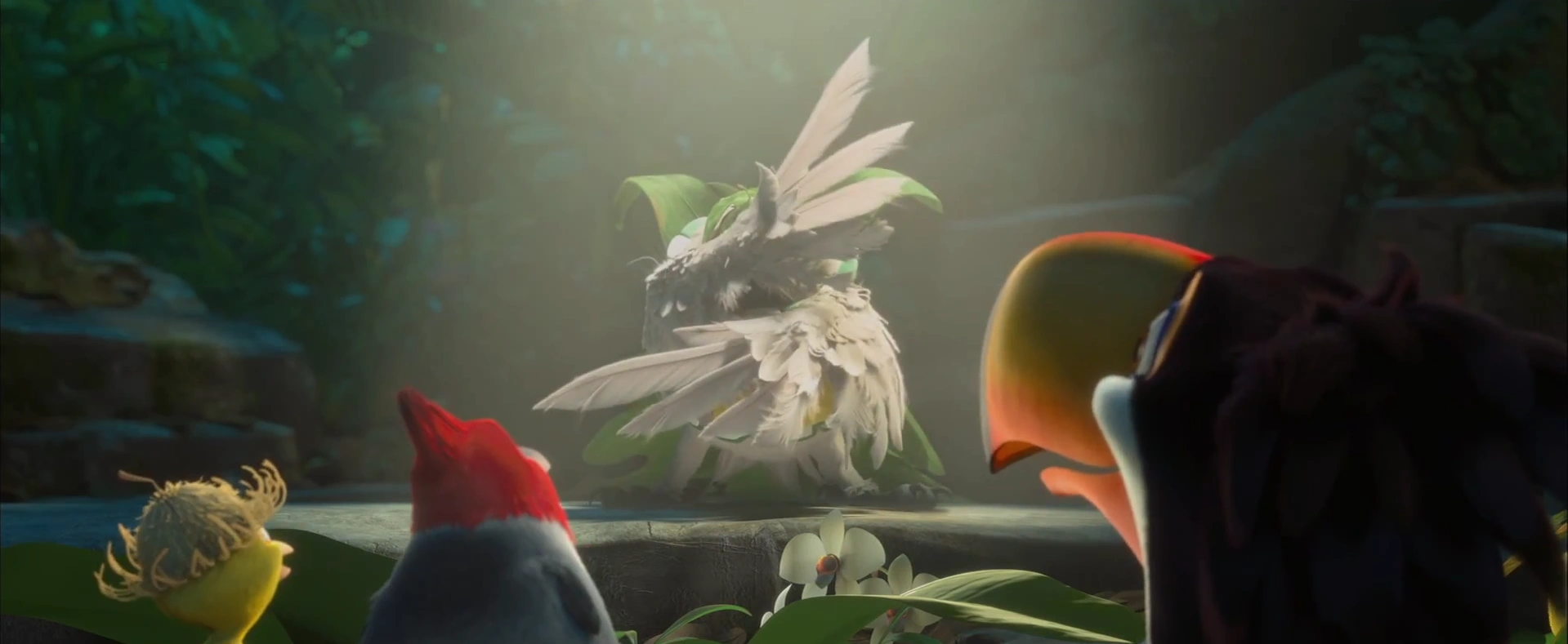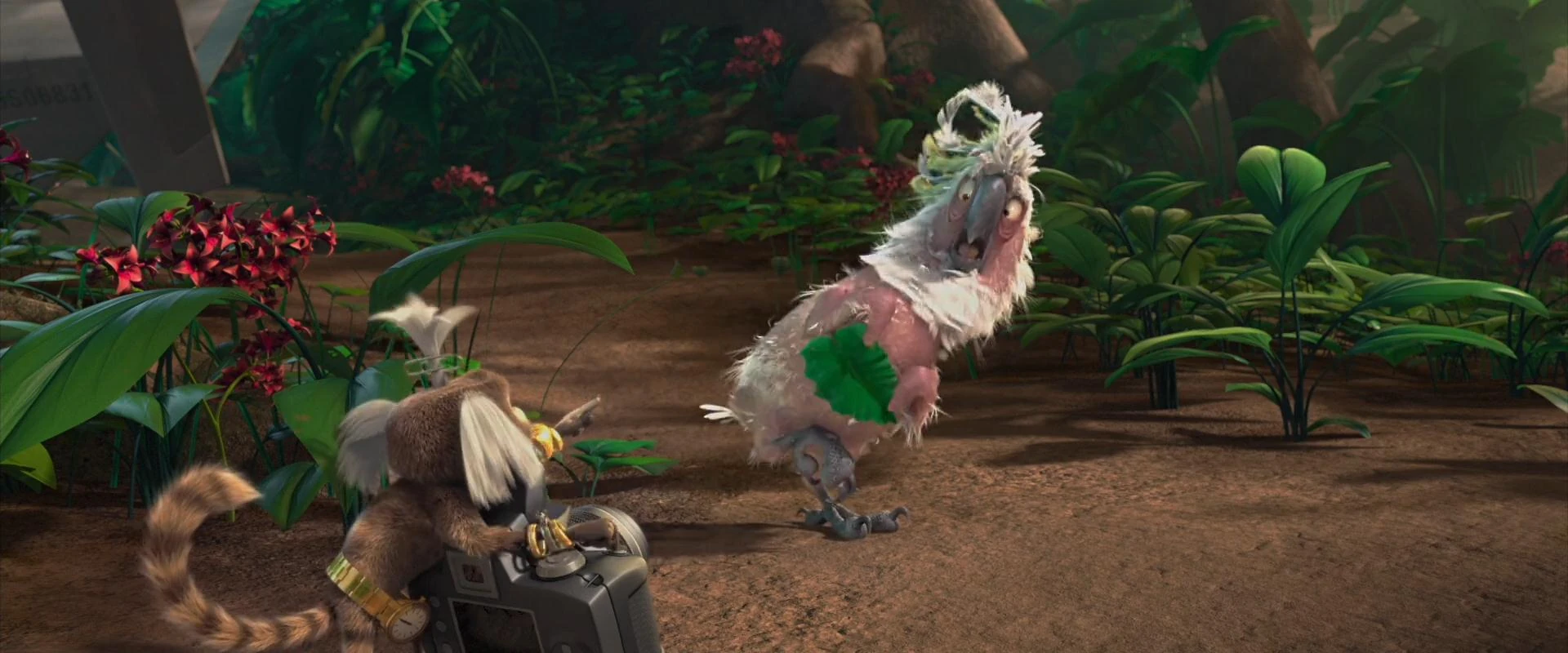 Mais tarde, eles encontram o refúgio das Ararinhas Azuis e Nigel se fantasia com uma máscara de folhas e pseudônimo de "Caco Cacatua". Ele canta a música "I Will Survive" ("Eu Vou Viver") e é convidado a participar do show de talentos na tribo, vendo assim a oportunidade de matar Blu.