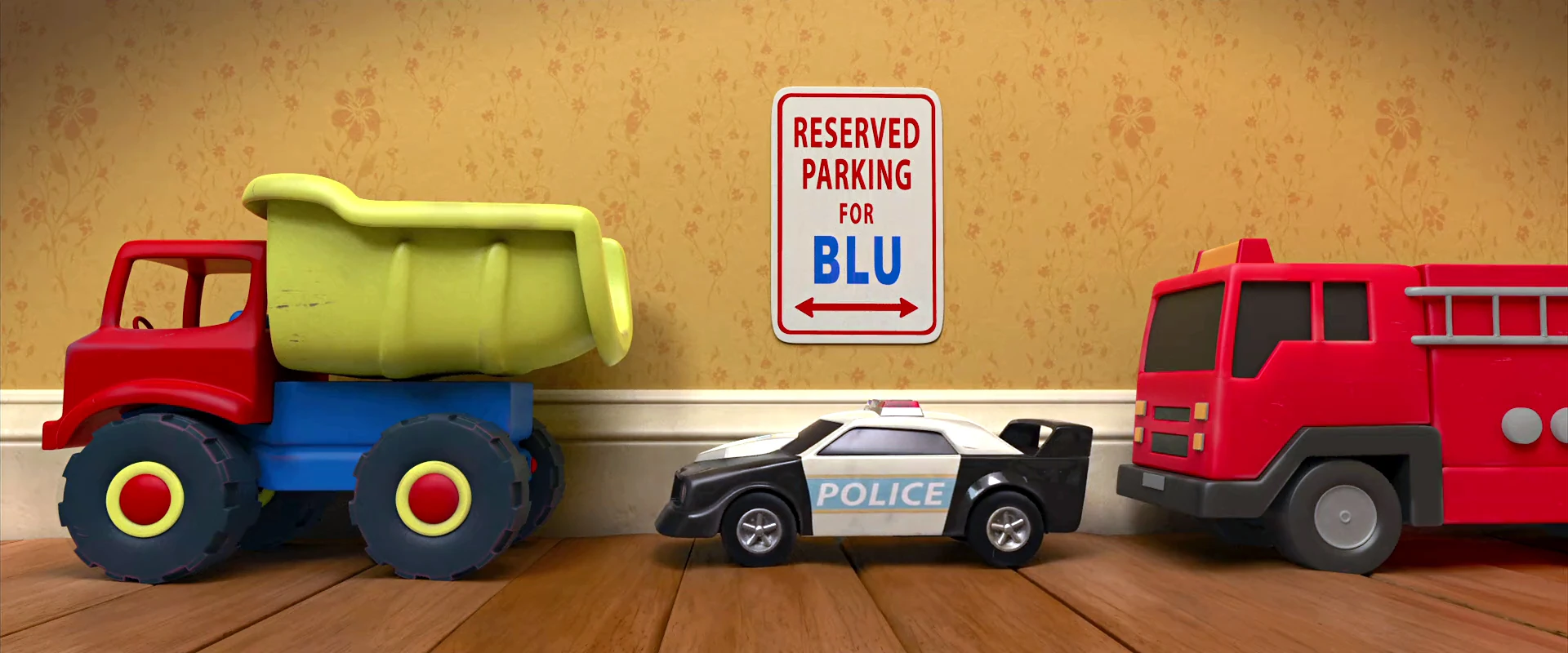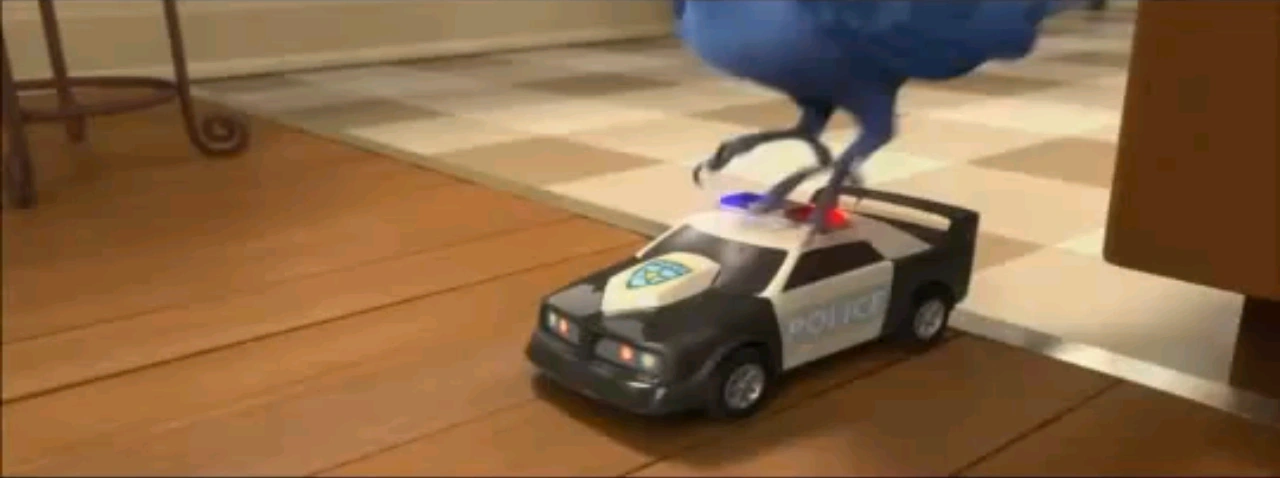 Blu briefly rode it during his "morning routine," pushing it with his foot like in a skate, and imitating siren sounds. He maneuvered it into a space between two other toy cars, above which was a sign reading "reserved for Blu."