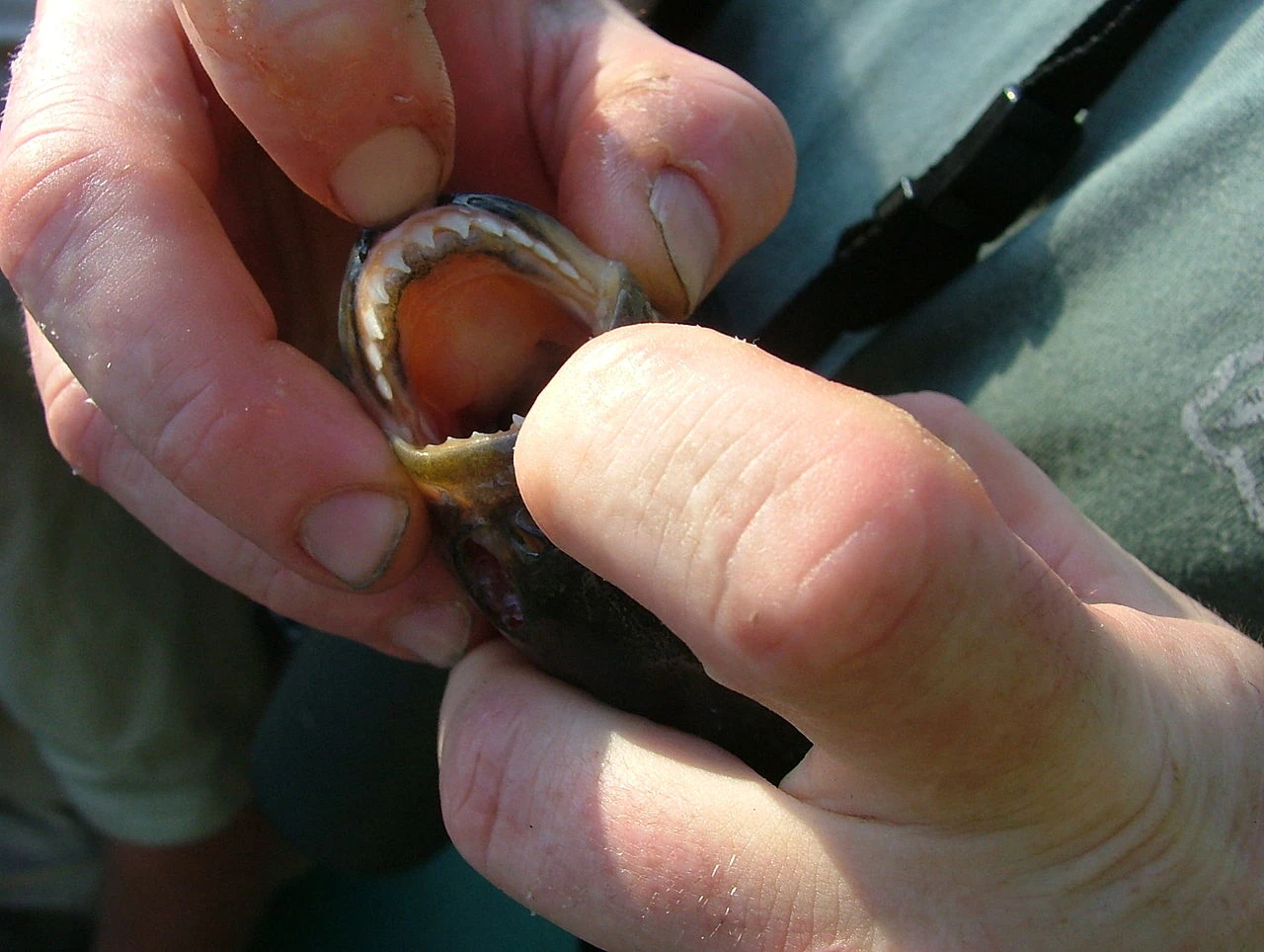 Piranhas have one of the strongest bites found in bony fishes. Relative to body mass, the black piranha (Serrasalmus rhombeus) produces one of the most forceful bites measured in vertebrates. This extremely powerful and dangerous bite is generated by large jaw muscles (adductor mandibulae) that are attached closely to the tip of the jaw, conferring the piranha with a mechanical advantage that favors force production over bite speed. Strong jaws combined with finely serrated teeth make them adept at tearing flesh.