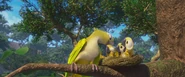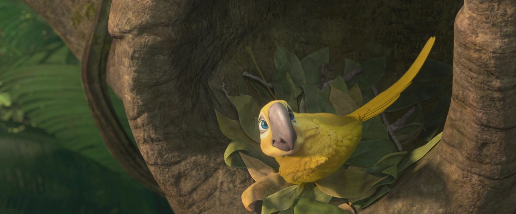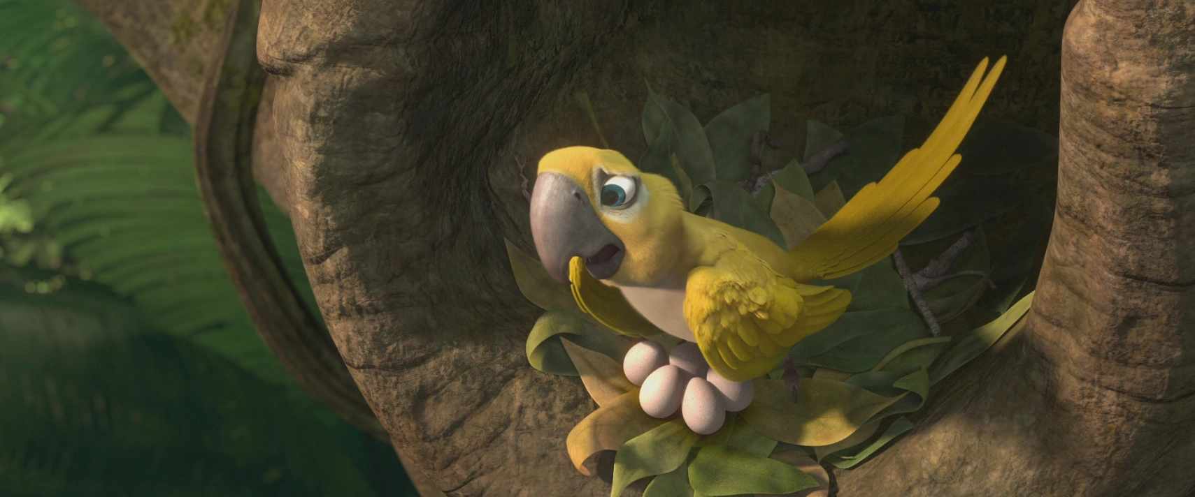 Three baby conures and their mother appear at the beginning of the movie. The babies are shown in a nest, all with yellow feathers, brown eyes, and white bellies. The mother is the same, but with blue eyes and a lighter beak. Two of the three are shown flying, which the two smash into each other, and then fly up again. It is unclear whether the macaw chicks were caught or not. Later, a yellow chick is seen in a cage during Nigel's song. Also, when Blu rescues the birds, three golden conures fly out of the plane.